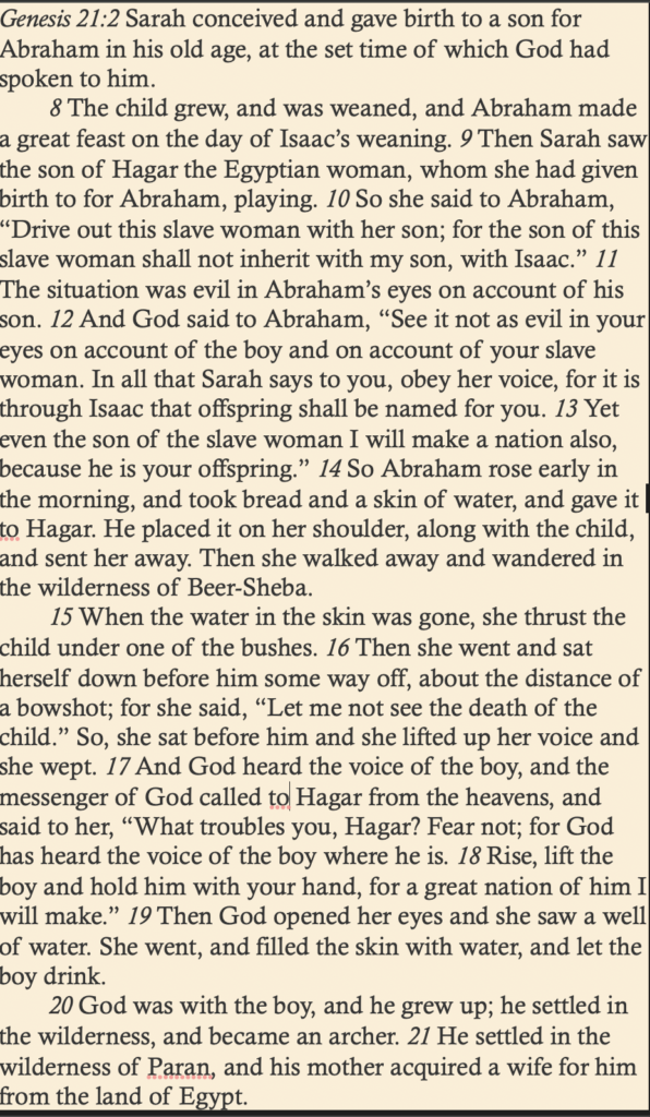 June 21, 2020 4:24 amWhat jumped out of this story was that Hagar wept, but God didn’t respond to her cry. Instead God responded to Ishmael’s cry.